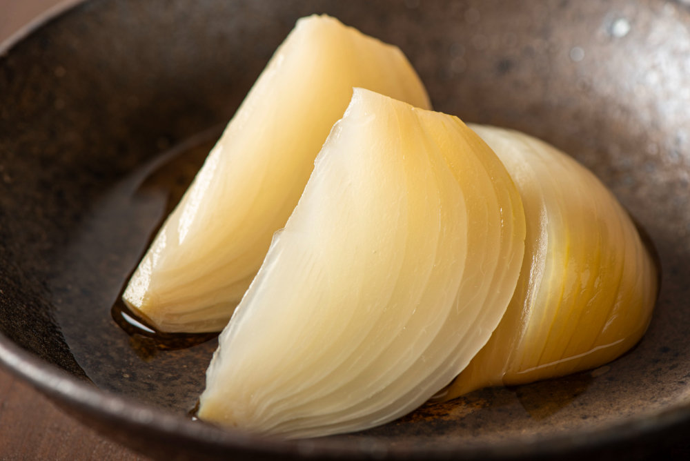 玉ねぎを半割し、やさしい塩味で醤油漬け。