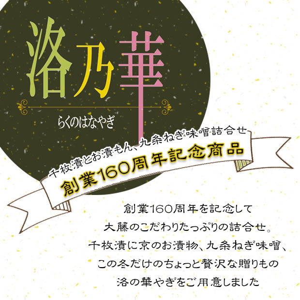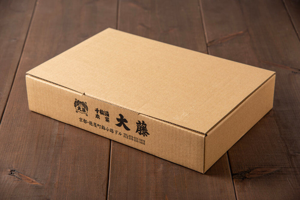 【千枚漬】280g 【大藤の九条ねぎ味噌】80g 【なのさくしば】60g 【日の菜】1本 【きざみすぐき】60g 【お茄子の味しば漬】60g |