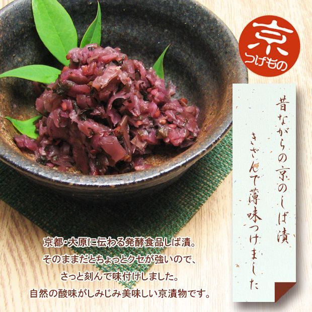 京都三大漬物のしば漬に胡瓜、みょうがを入れ食べやすく調味したお漬物。自然の酸味がしみじみ美味しい京漬物です。